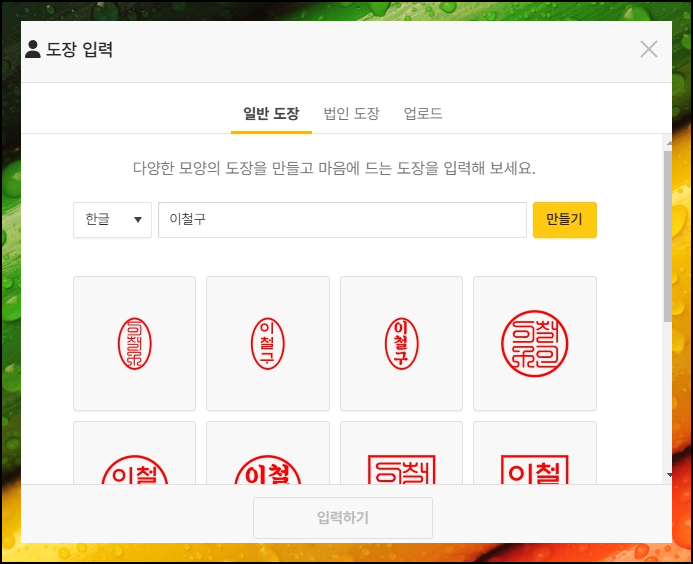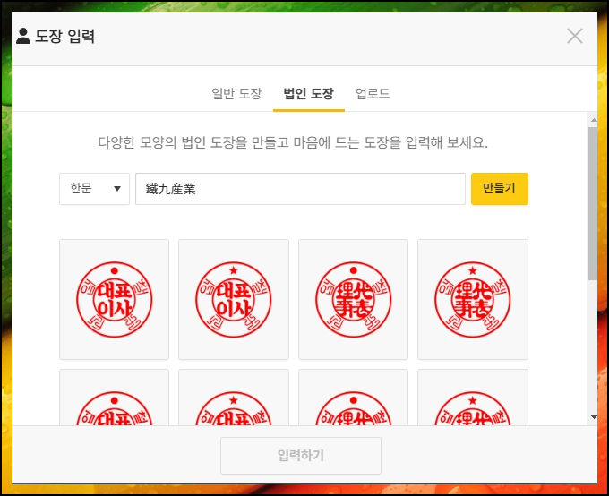등록 버튼을 누르면 이렇게 도장 만들기 창이 열립니다. 이 프로그램을 어떻게 이용하는지 알려드릴게요. 그냥 이름이나 상호명을 한글 또는 한문으로 입력한 다음에 [만들기] 버튼을 누르면 됩니다. 그럼 여러 가지 디자인으로 된 리스트가 나타나는데요. 여기에서 사용하고 싶은 것을 선택하면 돼요. 본인의 인감을 스캔하거나 찍은 이미지 파일이 있다면 이곳에 업로드하여 배경을 투명하게 만드는 것도 가능합니다.