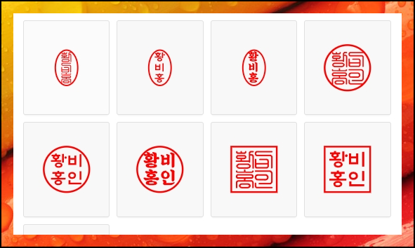 무료로 사용할 수 있는 프로그램을 방금 5초 만에 "황비홍"의 인감을 만들었습니다. 디자인도 여러 가지 다양해서 마음에 드는 것을 골라서 이용할 수 있죠. 무엇보다 배경을 투명하게 만들기 가능하다는 것입니다. 이렇게 투명 배경을 사용해야 어느 문서에서든 이질감 없는 서명으로 이용이 가능합니다.