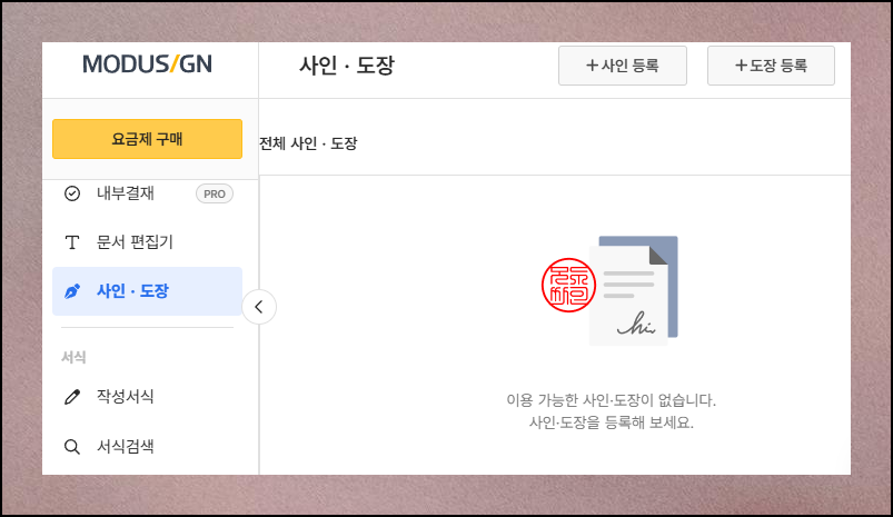 로그인 후 나타나는 화면에서 좌측에 있는 메뉴를 보면 도장 관련 메뉴를 찾을 수 있습니다. 해당 메뉴 선택 후에 [도장 등록] 버튼을 눌러주세요.