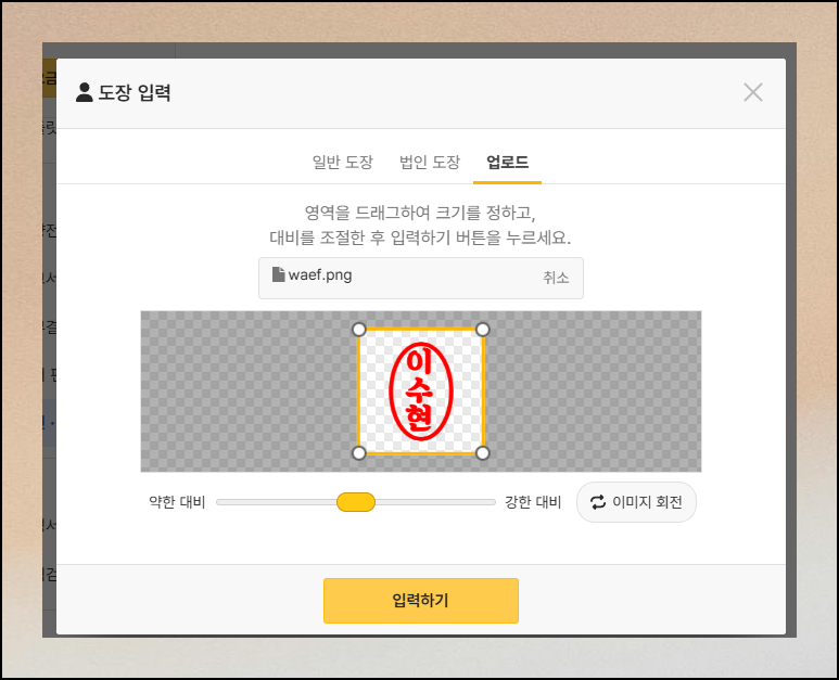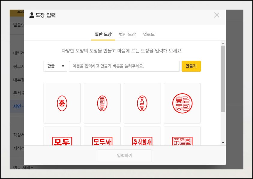 새롭게 열린 창을 보면 일반용, 법인용, 업로드 이렇게 3가지 방법으로 도장 이미지를 얻을 수 있습니다. 우리가 이번에 사용해야 할 것은 3번째인데요. 스캔을 한 이미지 파일을 가지고 진행하는 방법입니다. 나머지 방식은 한글이나 한자만 입력하면 바로 도장 이미지를 만들 수 있기 때문에 좀 더 간편해요.