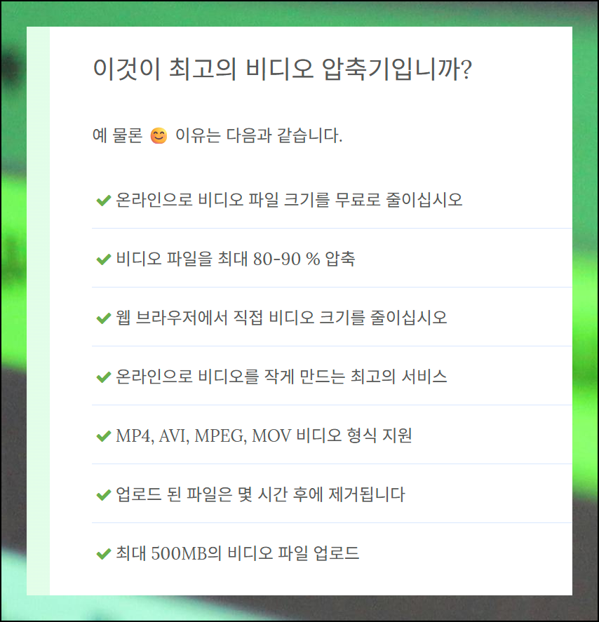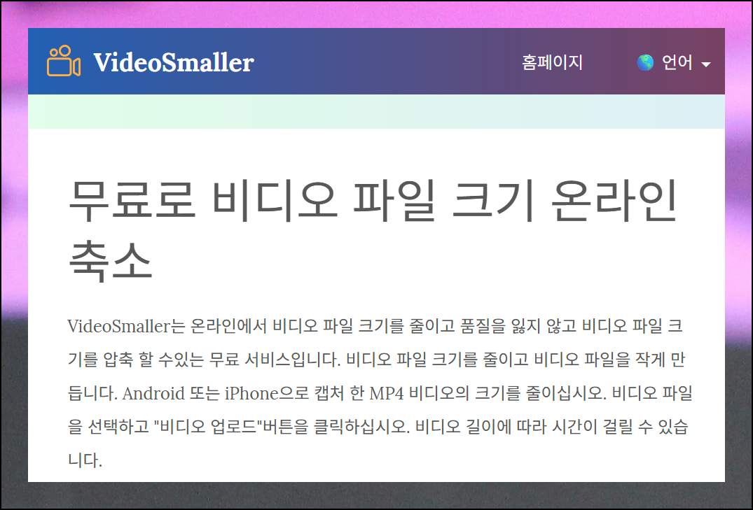 Video Smaller 사이트에 접속하면 바로 동영상 압축 작업을 바로 시작할 수 있어요. 복잡한 회원가입이나 프로그램 설치 과정이 전혀 없습니다.