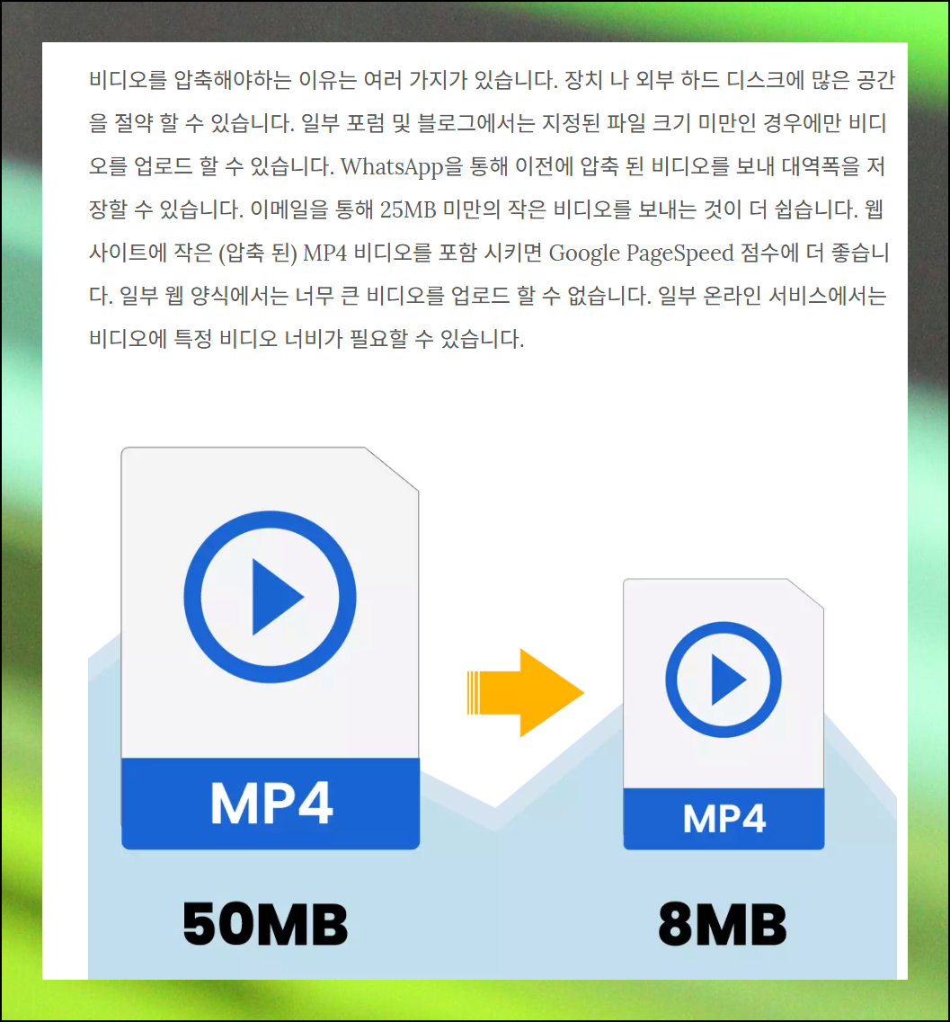 실제 테스트 결과를 보면 압축 효과가 정말 뛰어나요. 원래 50MB였던 MP4 파일이 단 8MB로 줄어든다고 하니까요.