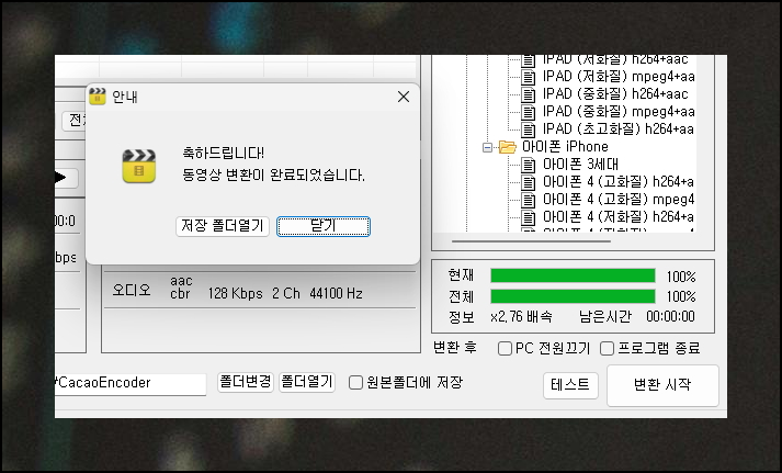 변환이 완료되면 안내 메시지가 표시됩니다. 저장 폴더 열기를 선택하면 새롭게 만들어진 파일을 바로 확인할 수 있어요.