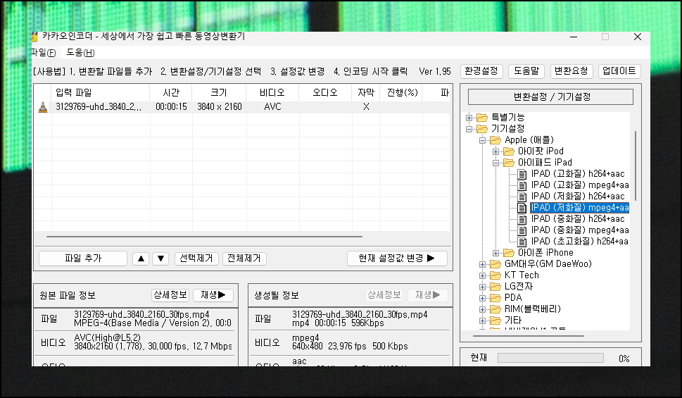 복잡한 설정 대신 미리 준비된 프리셋을 활용하면 손쉽게 원하는 결과를 얻을 수 있어요. 화질은 용도에 따라 저화질이나 중화질 중에서 선택하시면 됩니다.