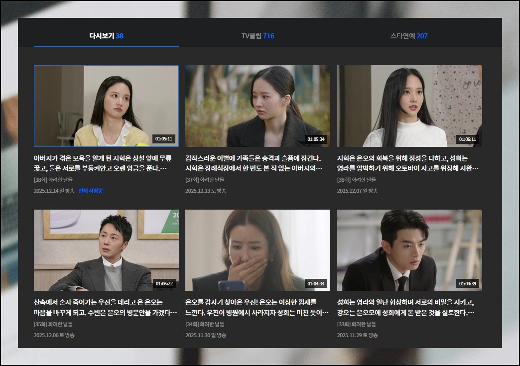 페이지에 접속한 뒤 드라마 카테고리를 선택해 보세요. 러브 트랙, 화려한 날들 같은 현재 방영되고 있는 작품들을 만나볼 수 있어요. 최신 회차가 빠르게 업데이트되니까 놓친 방송도 금방 확인 가능합니다.