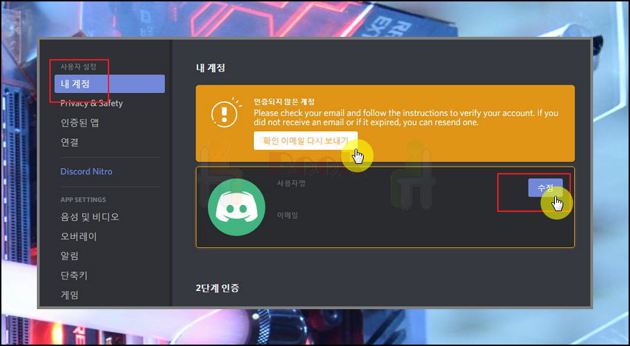 메일함을 아무리 뒤져보아도 없는 경우에는 설정에 들어가셔서 확인 이메일 다시 보내기 버튼을 눌러주세요. 그래도 여전히 디스코드 이메일 인증 오류가 발생하면 사용자 설정에 있는 내 계정을 클릭하여 수정 버튼을 눌러줍니다.