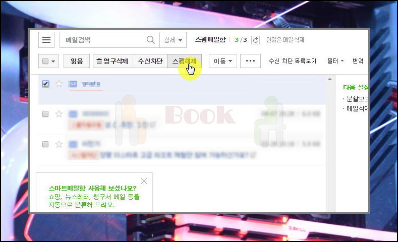 스팸함에서 디스코드에서 보낸 메일을 찾았다면 스팸해제 버튼을 눌러서 일반 메일함으로 옮겨 줍니다.