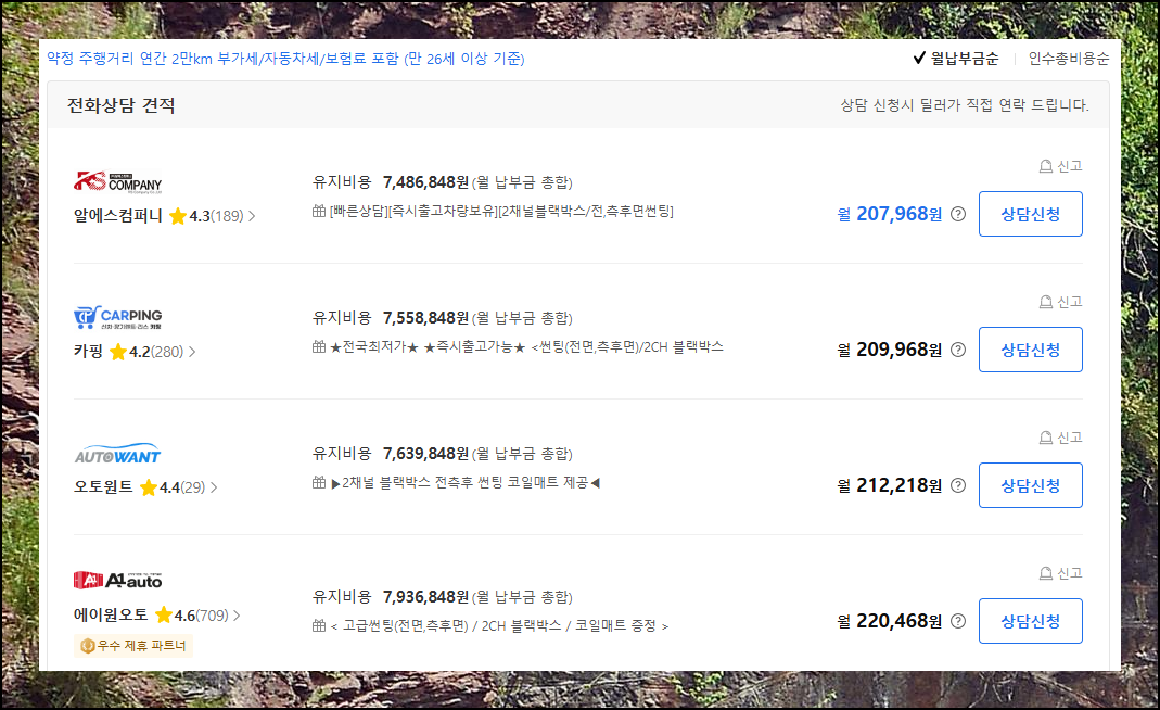 가격표 하단에 렌트카 업체별 견적 목록이 제공됩니다. 마음에 드는 대여 조건이 있다면 상담 신청을 통해 추가 정보를 얻을 수 있어요.