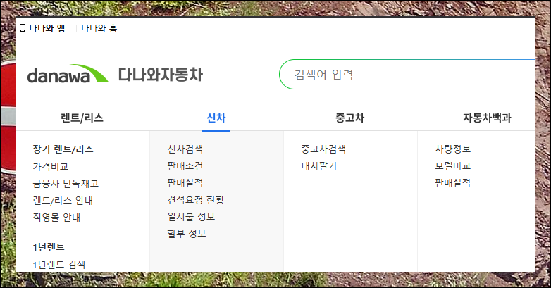 이번 시간에 이용할 사이트는 "다나와 자동차" 인데요. 이곳의 경우 신차, 중고차뿐 아니라 리스와 렌트카에 대한 정보를 한눈에 파악할 수 있어요. 서로 비교도 쉽게 할 수 있죠. 렌트카 장기대여를 생각한다면 이곳에서 효과적으로 검토할 수 있습니다.