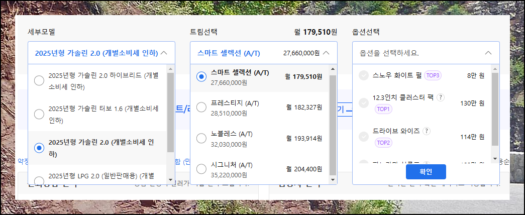 추가적으로 세부모델, 트림, 옵션 조건을 선택할 수 있는데요. 이러한 선택에 따라 렌트카 장기대여 요금이 달라집니다. 자신에게 꼭 필요한 사양과 예산을 고려하여 적절하게 선택해 주세요.