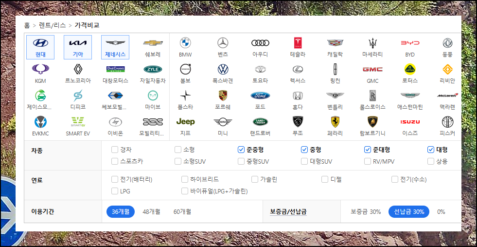선호하는 브랜드(복수선택 가능), 차종, 연료타입, 계약기간, 보증금 또는 선납금 여부를 순차적으로 입력하세요. 이러한 선택을 통해 나에게 알맞은 장기 렌트카 상품을 구할 수 있습니다.