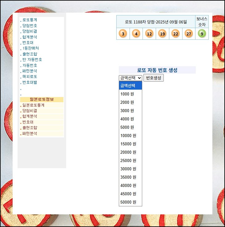 로또번호와 관련한 다양한 기능들이 한 페이지에 정리되어 있어요. 좌측 메뉴에서 자동번호를 선택하면 자동생성기 프로그램을 사용할 수 있습니다. 구매 계획 금액을 입력하고 버튼을 누르기만 하면 예상 조합을 즉시 받아볼 수 있어요.