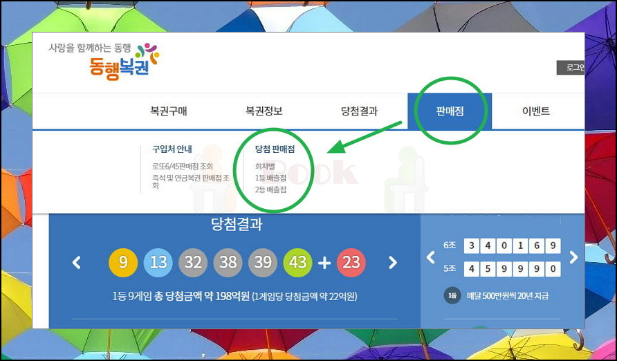 공식 사이트에 접속하게 되면 가장 먼저 눈에 띄는 것은 당첨결과에요. 홈페이지 상단에는 복권구매, 복권정보, 추첨결과, 판매점 등의 메뉴가 나타나고요. 로또1등 당첨지역에 대한 주소 정보를 알아보고 싶다면 판매점 메뉴에 있는 로또1등 배출점을 클릭해 주세요.