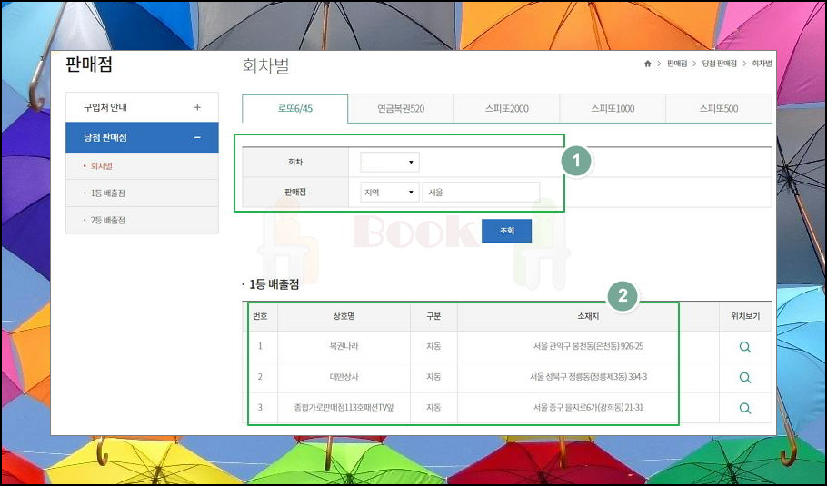 최근에 로또1등을 배출한 명당을 살펴보았어요. 공식 사이트를 통해 정확한 위치를 알아볼 수 있어요. 서울을 지준으로 당첨지역 및 주소를 여러 곳 살펴보니 관악구, 성북구, 중구에 있는 판매점이 나타났네요. 회차를 지정할 수 있기 때문에 이전에 로또1등이 나온 명당 리스트도 조회해볼 수 있어요.