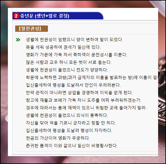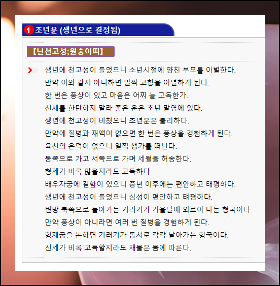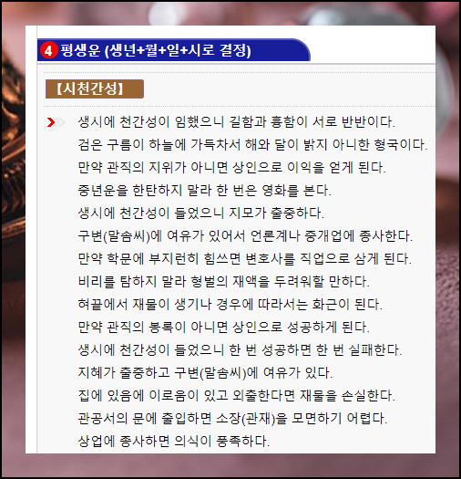 자신의 인생이 어떠한 운명을 맞이하게 될지 궁금한 분이라면 당사주 보기를 추천하고 싶습니다. 왜냐하면 초년운, 중년운, 말년운을 알려주는 것은 물론이고, 해석이 꽤 상세하기 때문입니다.