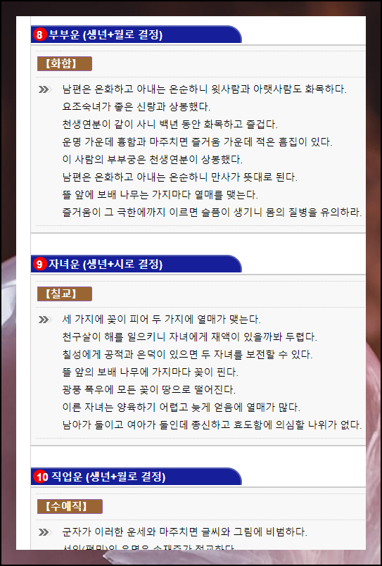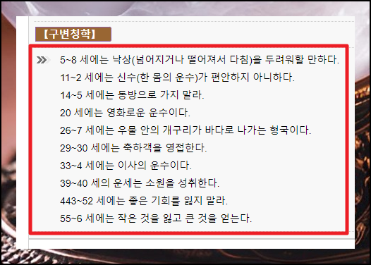 나이대별 알 수 있는 운 외에도 이렇게 특정 부분에 있어서 깊이 있게 알려주기도 하는데요. 심성운, 신체부위운, 형제운, 부부운, 자녀운, 직업운, 출세복, 가택운, 수명운을 살펴볼 수 있습니다.