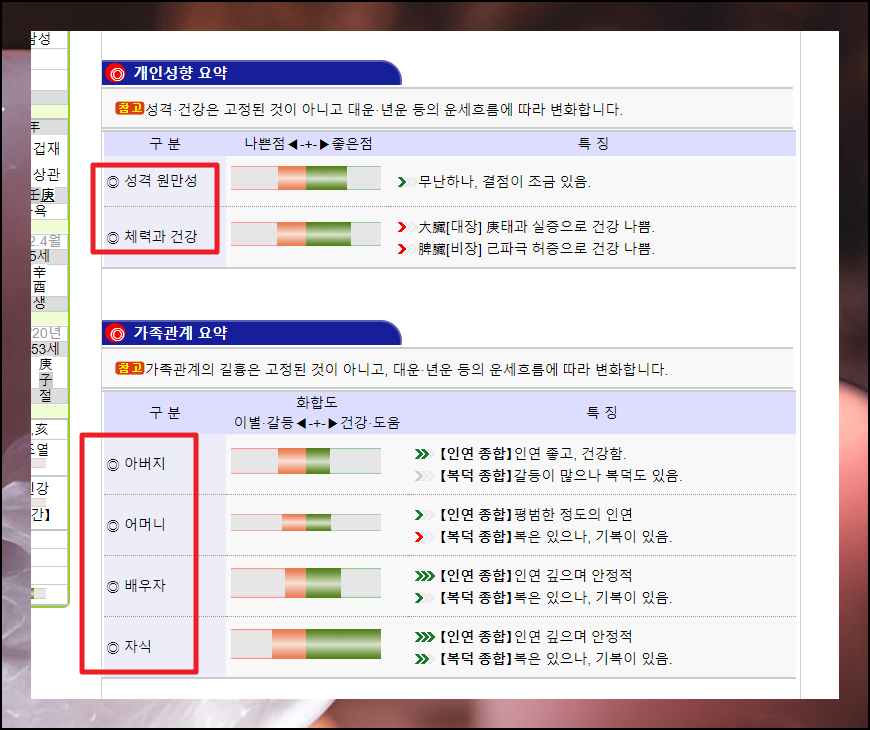 사주정보를 입력하면 이렇게 풀이가 나타납니다. 가장 먼저 개인성향과 가족관계 인데요. 개인성향을 통해 자신의 몸과 정신에 대한 건강이 어떠한지 알 수 있고, 가족관계 부분에서는 아버지, 어머니, 배우자, 자식에 대하여 나와의 화합도와 특징을 알려줍니다.