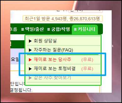 좀 더 상세한 풀이와 해석을 보고 싶다면 메뉴에서 [커뮤니티]를 클릭해 보세요. 그럼 메뉴 선택을 통해 당사주와 토정비결 보기 가능한데요.