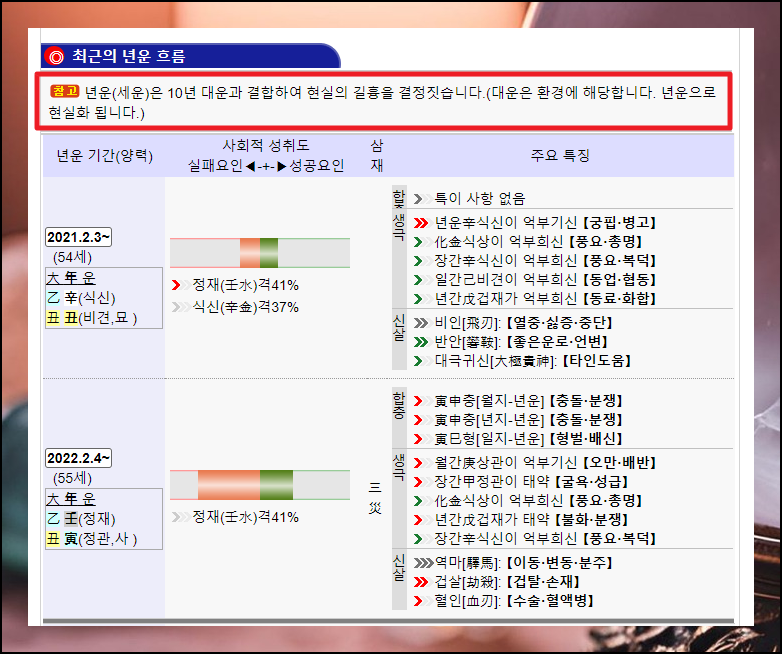 만세력에서 빠질 수 없는 것이 있죠. 바로 10년 주기로 내 운명에 크게 영향을 주는 대운과 1년 주기로 바뀌는 연운을 볼 수 있습니다. 여기서 말하길 대운은 환경, 연운은 현실화에 해당한다고 하는데요.