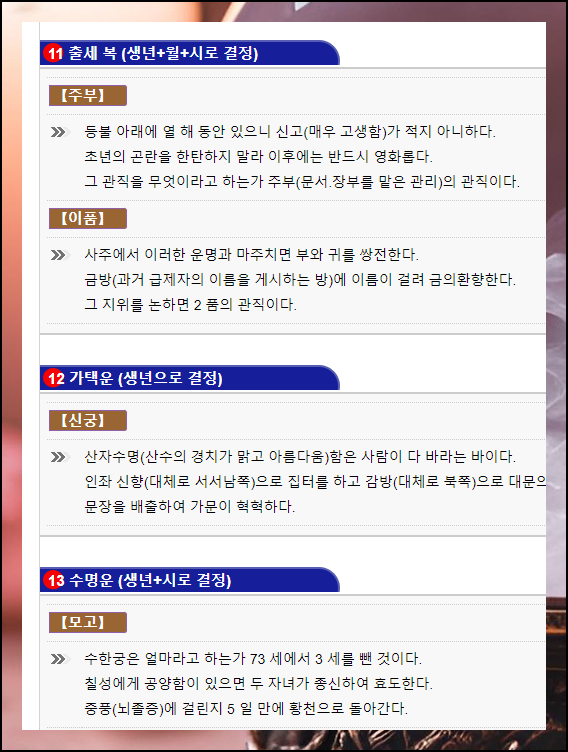 나이대별 알 수 있는 운 외에도 이렇게 특정 부분에 있어서 깊이 있게 알려주기도 하는데요. 심성운, 신체부위운, 형제운, 부부운, 자녀운, 직업운, 출세복, 가택운, 수명운을 살펴볼 수 있습니다.