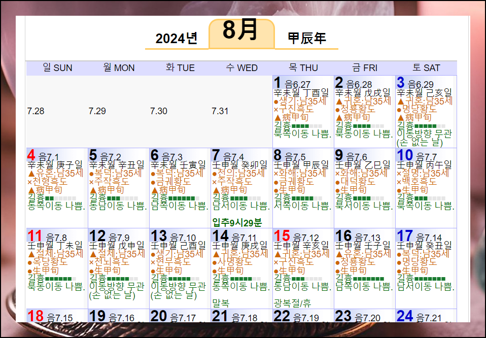 만세력을 기본으로 하여 만들어진 달력을 한 번 살펴보시죠. 이렇게 어느 날짜에 나에게 복이 들어오는지 알 수 있습니다.