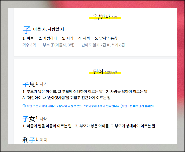 이름에 들어가는 글자의 뜻도 알 수 있어 여러모로 유용합니다. 모르는 문자의 의미를 정확히 알게 되면 문맥 이해도 훨씬 수월해져요.