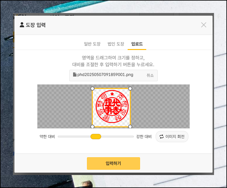이 기능으로 실제 인감을 스캔해서 디지털 이미지로 변환할 수 있습니다. 방법은 간편해요. 스캔한 인감 이미지를 올리기만 하면 됩니다.