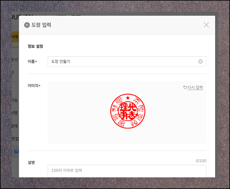 모든 과정이 마무리되면 이름을 지어주세요. 설명도 추가하면 나중에 쉽게 찾을 수 있습니다. 관리 페이지에서 도장 이미지 다운로드 받을 수 있는데요. 배경이 투명하게 처리되어 있기 때문에 어떤 문서에서도 자연스럽게 넣을 수 있습니다.