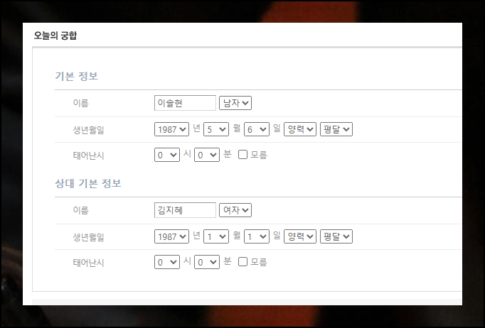오늘의 궁합 서비스는 매일 정해진 시간에 살펴보면 좋아요. 활용법은 간단해요. 다음과 같이 본인과 상대방의 이름, 생년월일, 태어난 시각만 입력하면 됩니다.