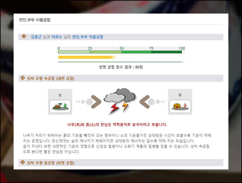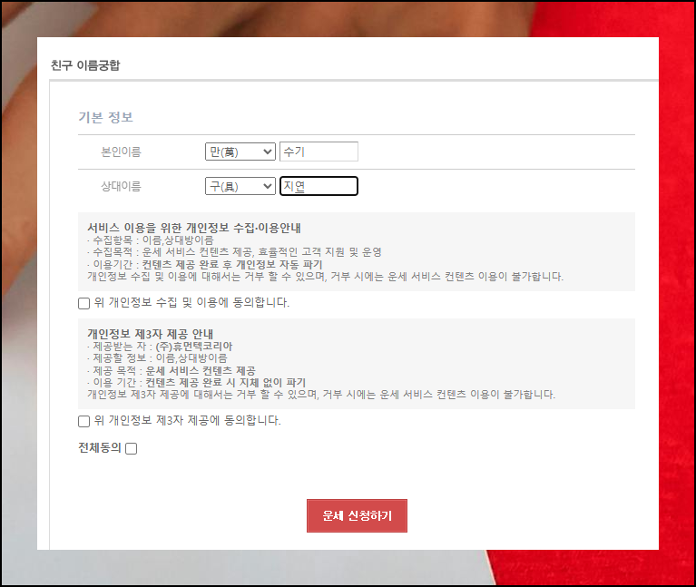 "연인, 부부 이름궁합" 서비스는 본인과 상대방의 성씨와 이름만 기입하면 돼요. 입력은 매우 단순하지만, 해석 내용은 상세하게 제공됩니다.