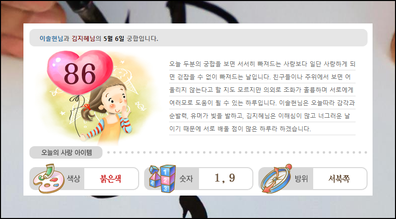 상대방과의 만남이나 대화 전에 미리 궁합을 점검하면 많은 도움이 됩니다. 데이트 시 참고할 수 있는 색상, 숫자, 방위 같은 사랑 아이템도 추천해 줘요.
