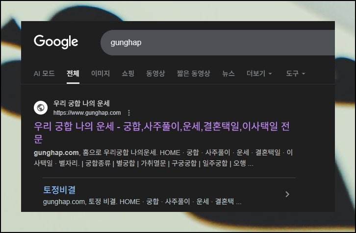 가장 손쉽게 이용할 수 있는 무료 운세 서비스를 알려드릴게요. 검색창에 "GUNGHAP"을 입력하면 만세력을 확인할 수 있는 곳이 바로 나타납니다. 이곳에서는 사주 해석부터 매월 흐름까지 비용 없이 볼 수 있는 서비스를 제공하고 있는데요. 원하는 내용을 클릭 한 번으로 간편하게 살펴볼 수 있어요.