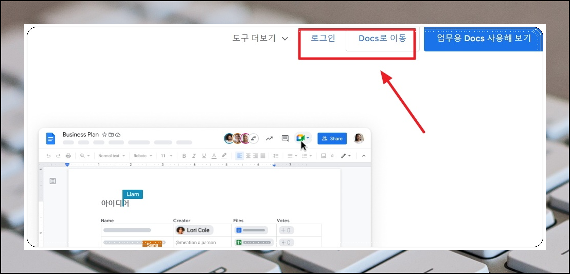 구글에 만든 무료 프로그램이기 때문에 해당 서비스를 사용하려면 구글 계정이 필요합니다. 안드로이드 스마트폰을 사용하는 분들이라면 기본적으로 구글 계정을 가지고 있을 거에요. 로그인 후에는 [Docs로 이동] 버튼을 클릭해 주세요.
