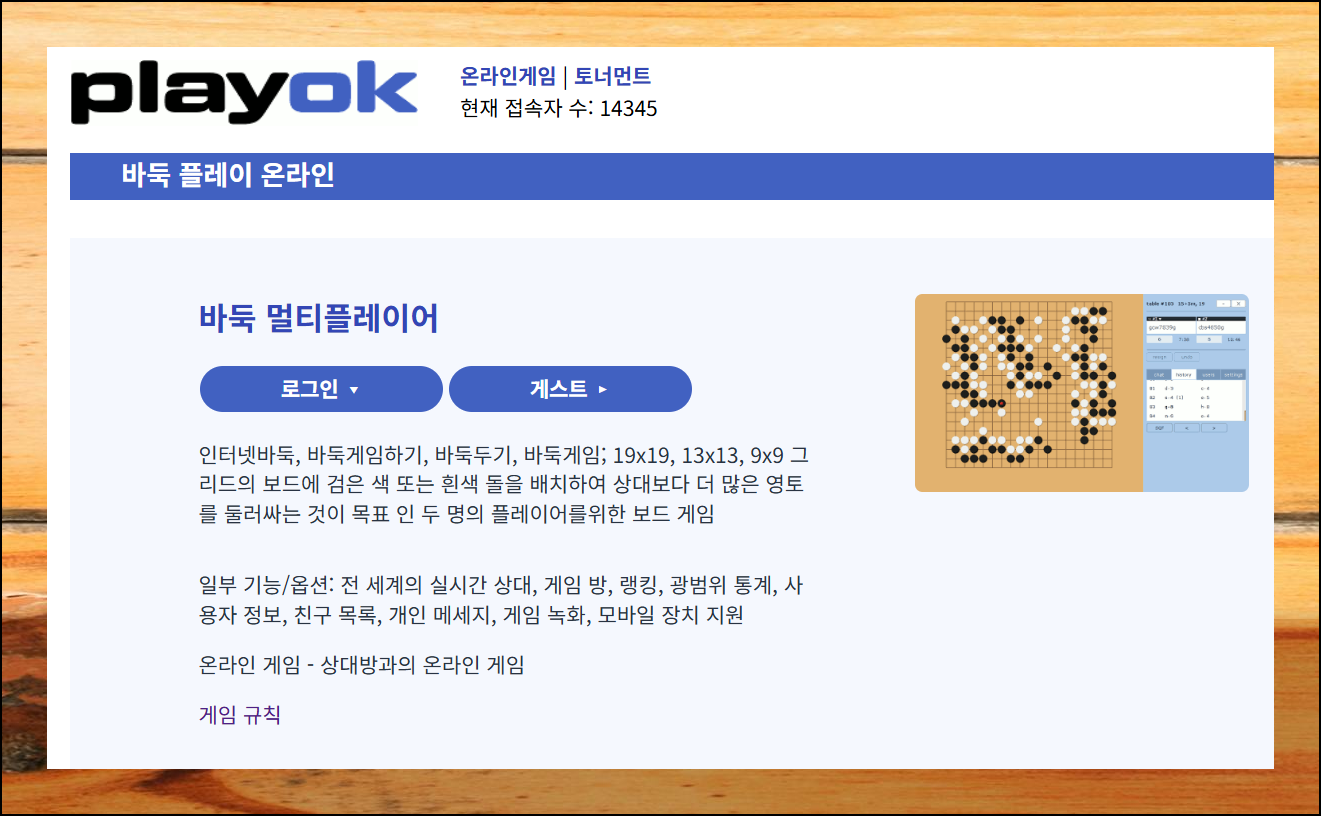 메뉴를 선택하면 바둑게임하기 진행이 가능한데요. 화면에 나와 있듯이 로그인과 게스트 두 가지 옵션이 표시가 돼요. 게스트로 접속하면 회원 등록 과정을 생략하고, 즉시 대국을 진행할 수 있어요. 다만 비회원 상태에서는 이력이 남지 않는다는 점을 알아두세요. 승부 기록을 남기고 싶다면 간단한 회원가입을 추천해요.