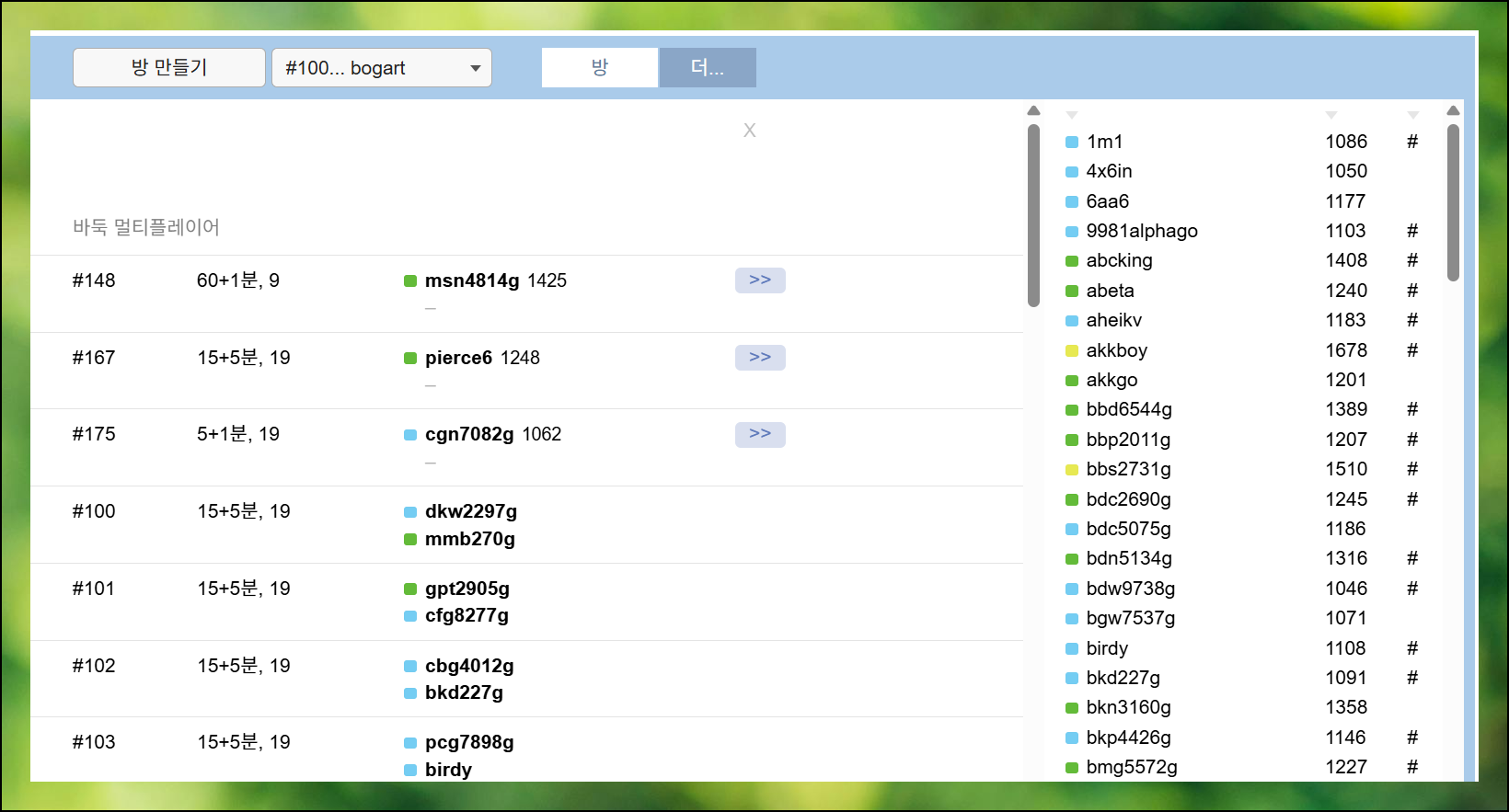 다른 사람과 바둑게임하기 위해서는 직접 방을 만들거나 다른 사람이 만든 방에 참여해야 해요. 실제 사람과 대결할 수 있기 때문에 컴퓨터를 상대할 때보다 훨씬 흥미진진합니다. 방을 개설하면 다른 사용자들이 참여하게 되고, 진짜 상대와 실력을 겨룰 수 있습니다.