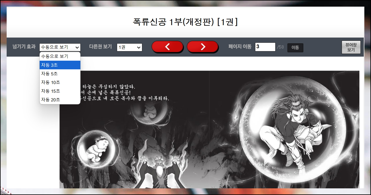 3초부터 20초까지 원하는 시간을 설정해서 자동으로 페이지를 넘길 수 있어요. 더욱 편하게 만화를 즐기세요.