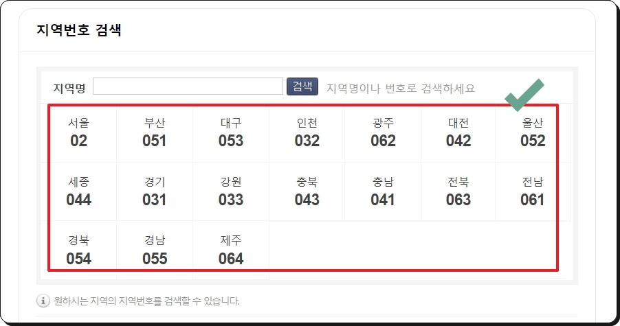그럼 한국으로 전화를 걸 때 사용할 지역번호를 찾아볼 수 있습니다. 서울은 02번, 부산은 051번, 대구는 053번 등 각 지역에 해당하는 코드가 정해져 있어요.