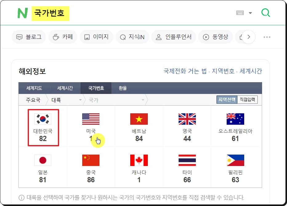 한국으로 전화하는 경우에는 82번을 사용하면 됩니다. 미국의 경우에는 1번을 사용하죠. 이 외에 다른 나라의 경우에도 각자 정해진 국가코드가 있는데요. 네이버에서 "국가번호"를 검색하면 대부분의 나라에 대한 국가코드를 조회할 수 있습니다. 여기서 미국을 눌러볼게요. 그럼 추가 정보 확인이 가능합니다.