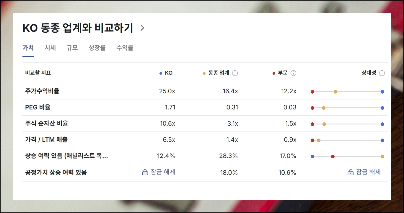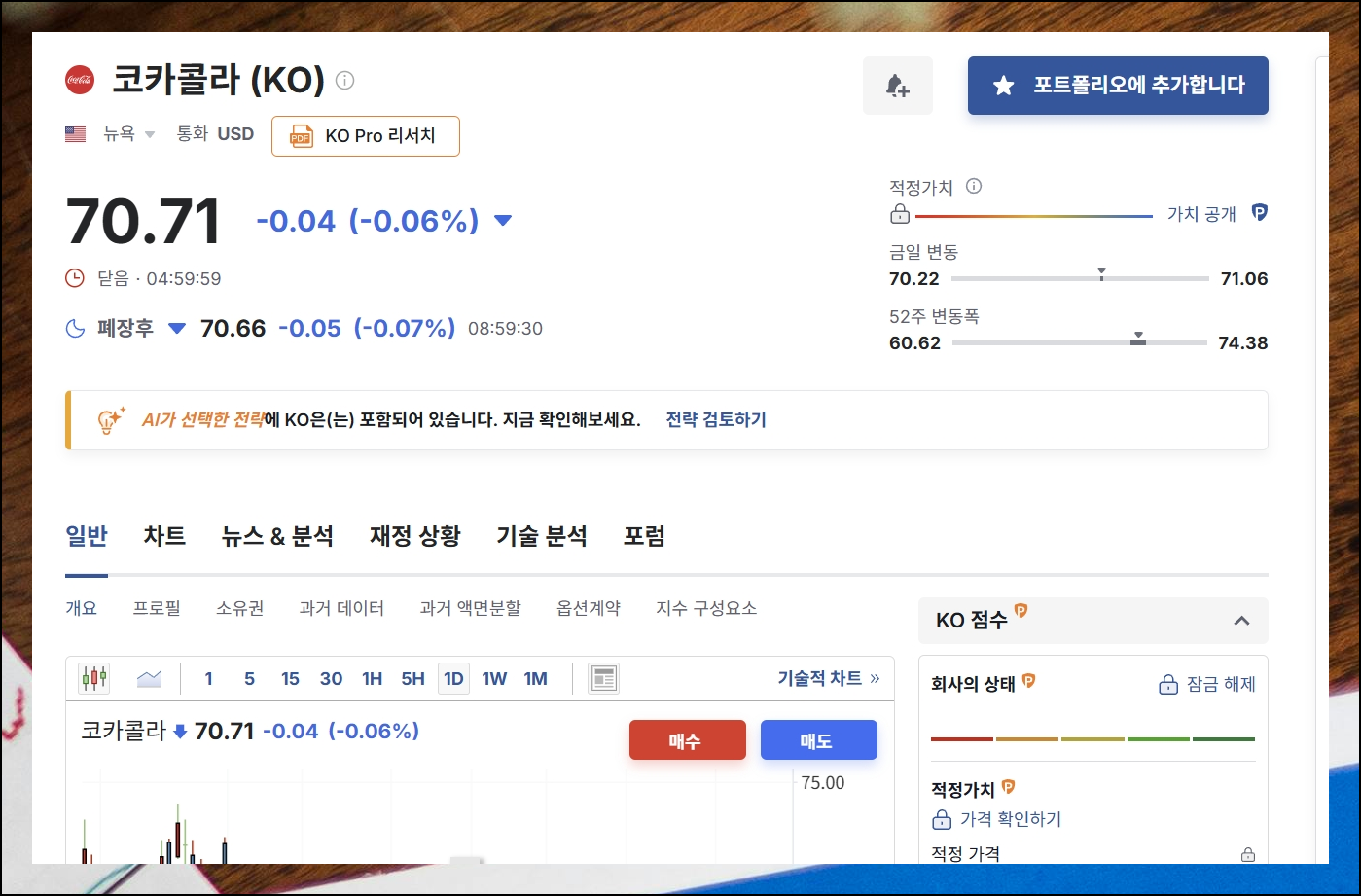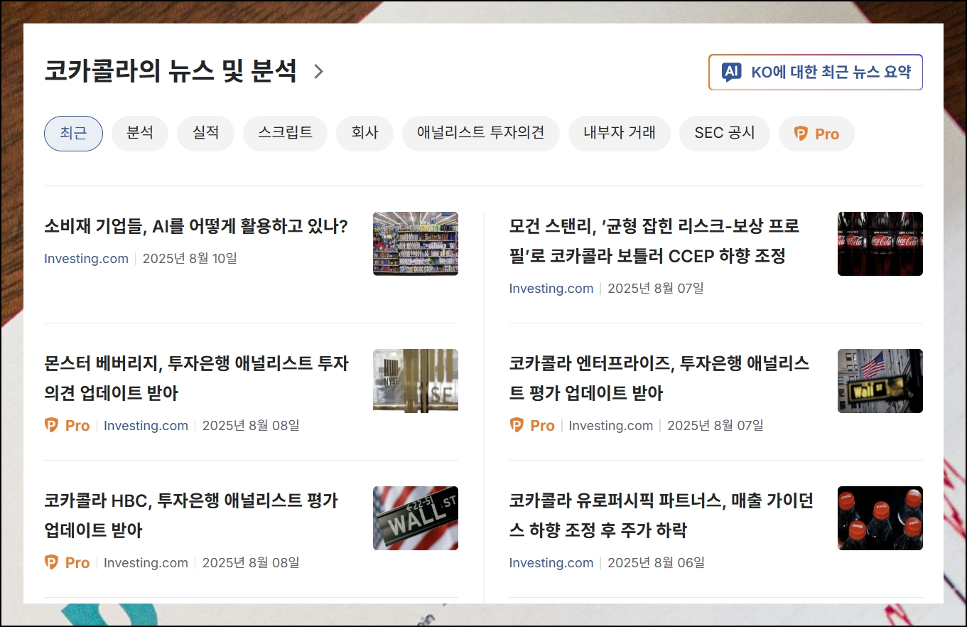 여러 종목이 한눈에 보이는 표에서 전체적인 미국증시 흐름을 파악했다면, 이제 특정 기업에 대해 더 깊이 있게 알아볼 차례입니다. 관심 있는 종목을 마우스로 클릭해보세요. 그러면 해당 기업의 상세한 정보 페이지가 열려요. 코카콜라를 예시로 선택해봤는데, 실시간 주가 정보는 물론 차트 분석, 관련 뉴스, 전문가 리포트 등 투자 결정에 필요한 모든 자료를 한 곳에서 확인할 수 있었습니다.
