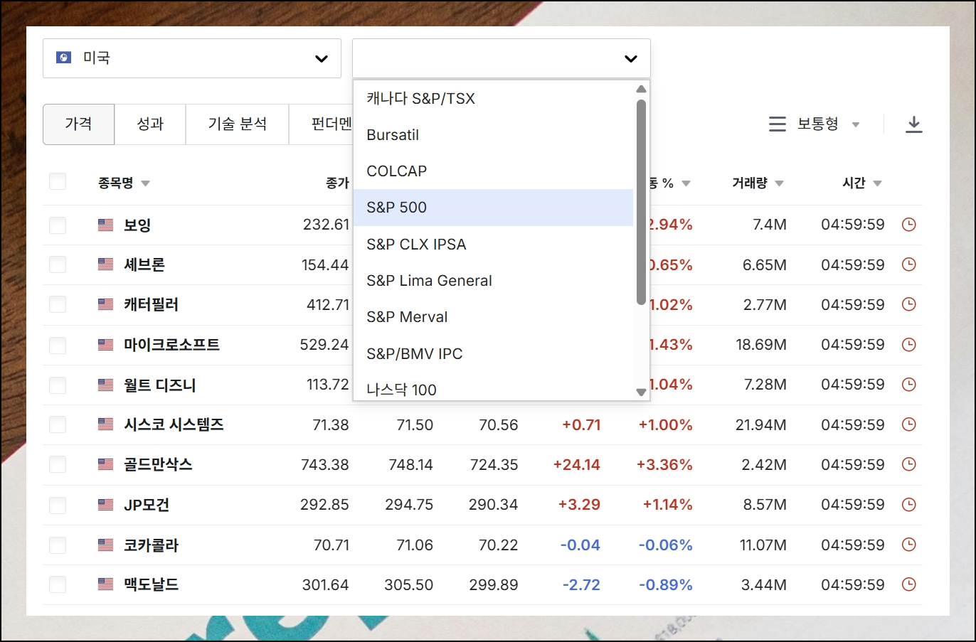미국증시 페이지에 성공적으로 도착했어요. 한국의 코스피, 코스닥과 마찬가지로 미국에도 핵심 지수들이 존재합니다. 나스닥, s&p500, 다우존스가 대표적이죠. 셀렉트박스를 선택해보세요. 그럼 해당 지수에 포함된 개별 주식들의 현재 상황을 실시간으로 보는 것이 가능합니다. 현재는 미국증시에서 매매가 이루어지는 시간이 아니기 때문에 수치들이 멈춰있지만, 개장 시간에는 모든 데이터가 실시간으로 바뀌는 것을 볼 수 있어요.