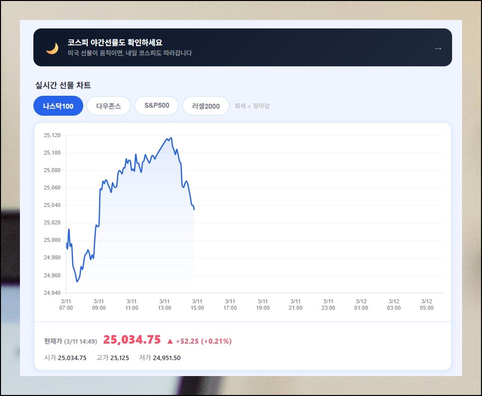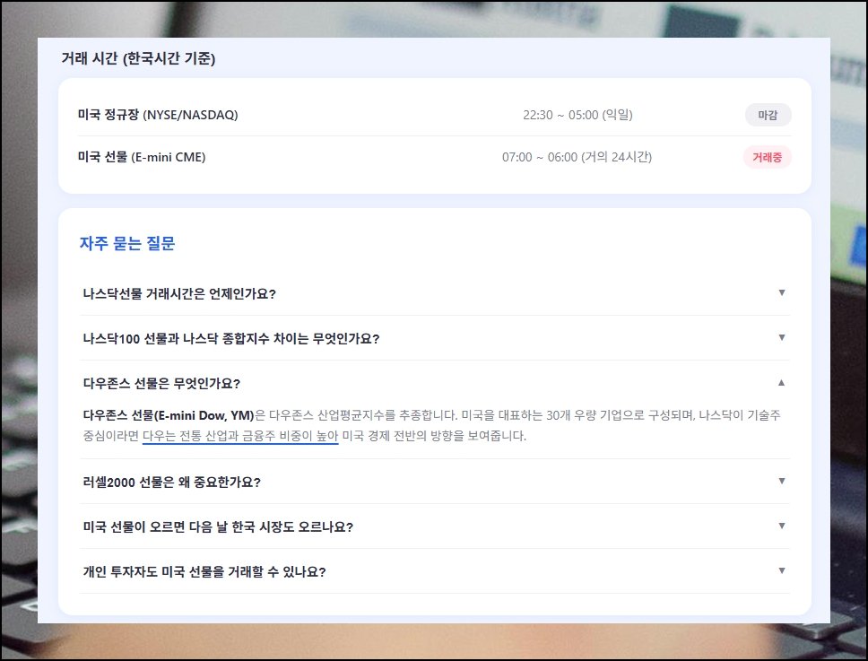 장이 끝났다고 투자 판단도 멈추는 건 아닙니다. 미국 증시 폐장 이후에도 선물 시장은 계속 돌아가고 있어요. 그래서 많은 투자자들이 다음 날 국내 장세를 예측하기 위해 미국 실시간 선물 지수를 확인하는 습관을 들이고 있습니다. 나스닥100, 다우존스, S&P500 같은 주요 지수의 움직임은 코스피와 높은 상관관계를 보이기 때문이에요.