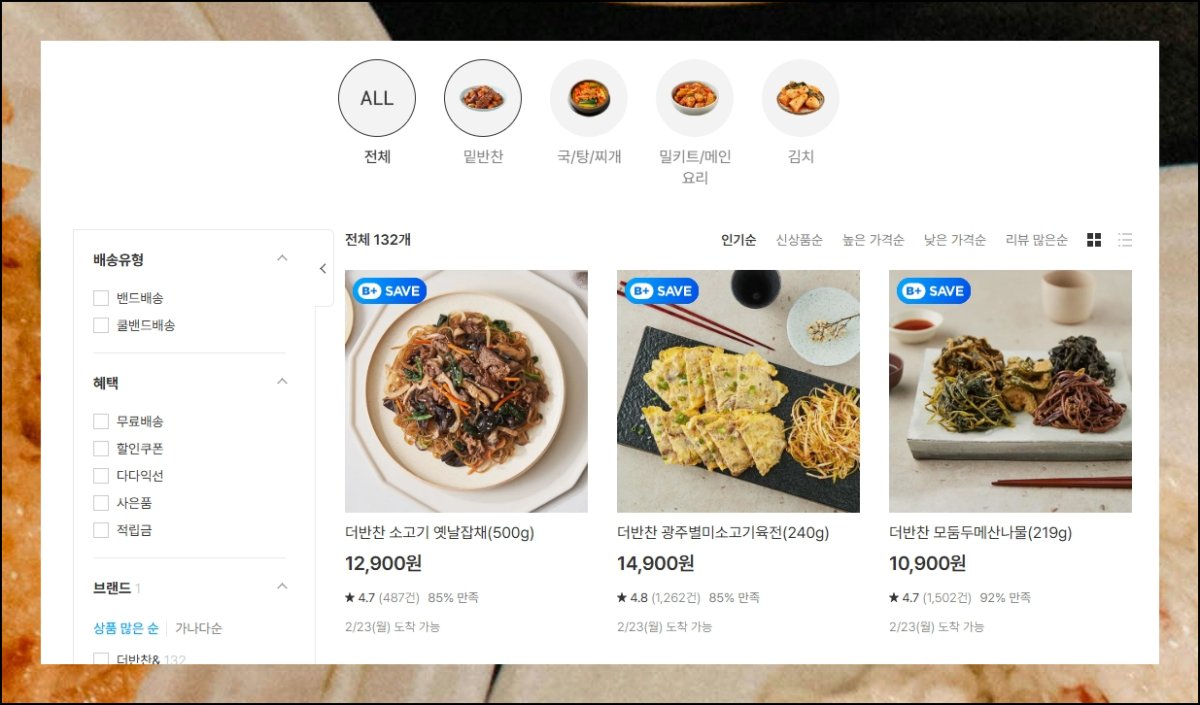 원하는 카테고리를 누르면 100가지를 웃도는 리스트가 나타납니다. 밑반찬 분류만 해도 수십가지를 훌쩍 넘어요.