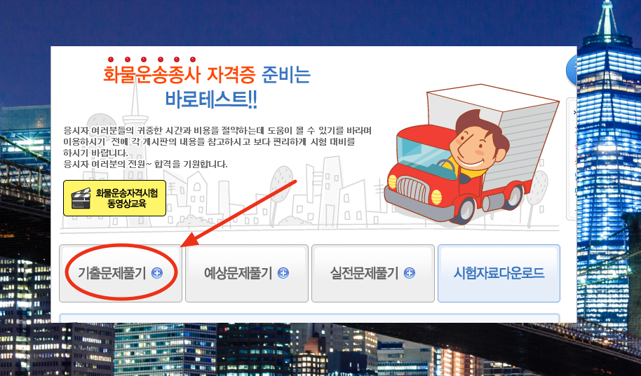 5. 이것은 운전을 업으로 하는 사람들을 위한 여러 가지 서비스를 제공하고 있는 곳입니다. 메뉴에서 "바로테스트"를 선택한 후 화물운송종사 자격시험을 선택해 주세요.