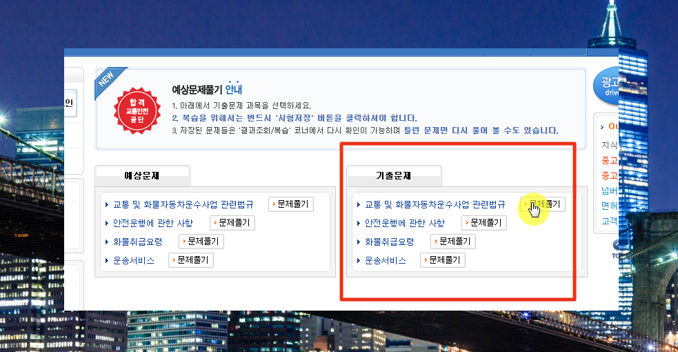 4. 이번에는 기출문제를 푸는 방법을 알려 드리겠습니다. 굉장히 많은 기출문제를 온라인 상에서 바로 프로필 수 있는데요. 당연히 정답 체크도 할 수 있습니다. 드라이버스 사이트에 접속해 주세요.