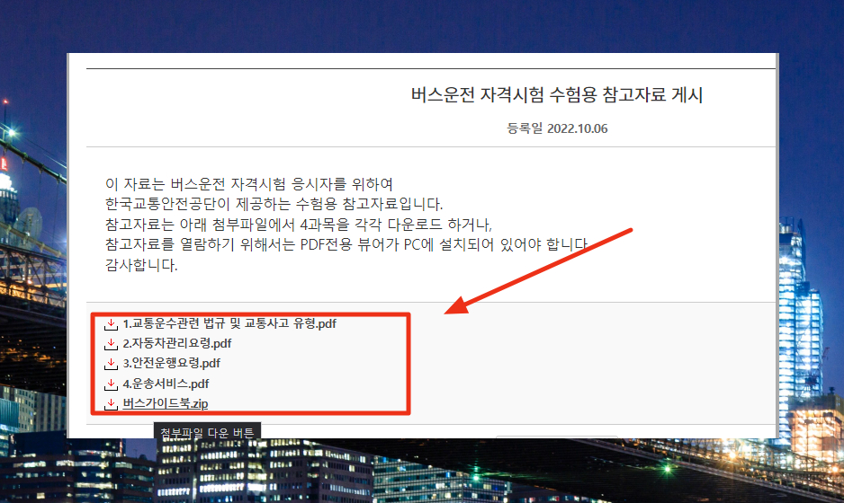 3. 버스운전 자격시험의 4가지 과목인 교통운수 관련 법규 및 교통 사고 유형, 자동차 관리 요령, 운송 서비스, 안전 운행 요령에 대한 수업용 참고자료 PDF 파일을 찾을 수 있는데요. 여기서 다운 받아 기본서로 사용하면 됩니다.
