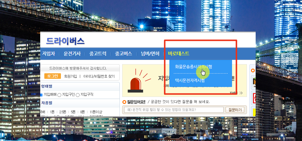 5. 이것은 운전을 업으로 하는 사람들을 위한 여러 가지 서비스를 제공하고 있는 곳입니다. 메뉴에서 "바로테스트"를 선택한 후 화물운송종사 자격시험을 선택해 주세요.