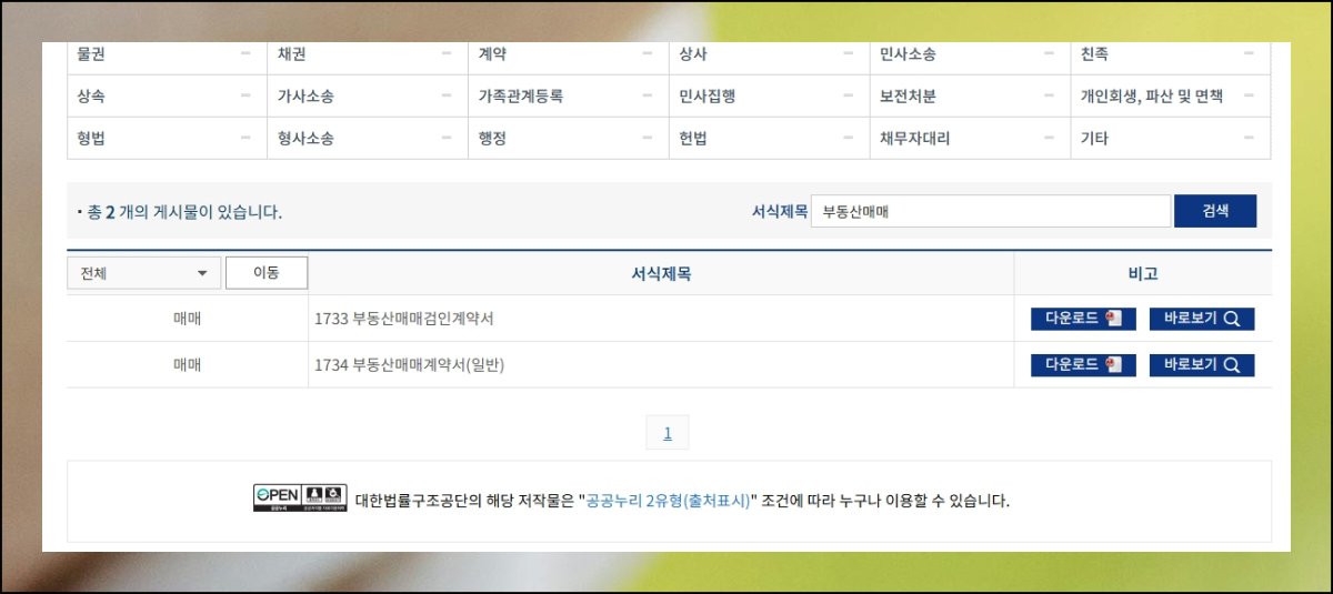 원하는 부동산 문서에 도달하는 절차가 매우 간소해요. 제목 검색란에 부동산매매라고 타이핑한 뒤 조회 버튼을 누르세요. 일반용과 검인용 두 종류의 매매계약서가 결과로 나타납니다. 마음에 드는 양식의 무료다운 버튼을 누르면 즉시 파일이 저장돼요.