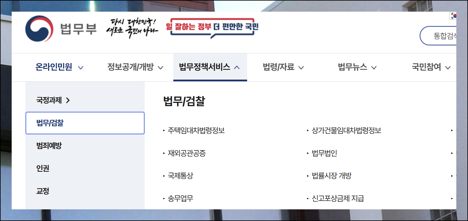 법무부 사이트에서는 다양한 서비스와 정보를 제공하고 있어요. 부동산 월세 계약서와 같은 무료 양식을 찾기 위해서는 법무정책서비스와 법무검찰 메뉴를 순서대로 클릭하면 됩니다. 누구나 쉽게 찾을 수 있도록 구성되어 있어요.