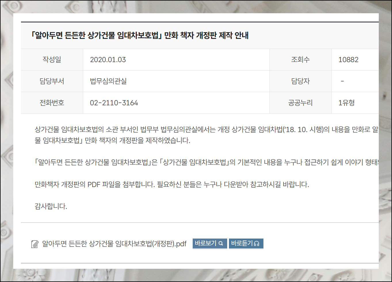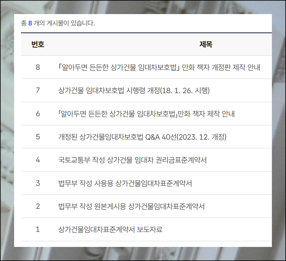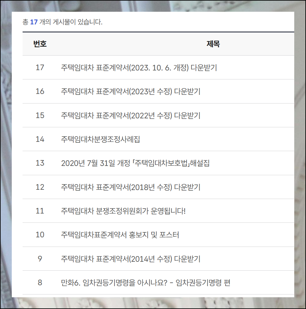이전 페이지에서 [자료실] 메뉴를 클릭해보세요. 부동산 임대차와 관련된 다양한 자료들이 무료로 제공되고 있습니다. 분쟁조정사례집이나 관련 만화 책자 등 실용적인 자료들을 찾아볼 수 있어요. 부동산 거래나 임대차 계약에 관심이 많으신 분들에게는 정말 유용한 정보들이 가득해요. 실제 사례를 통해 배울 수 있는 내용들이 많이 담겨 있어서 이론적인 지식뿐만 아니라 실무적인 팁도 얻을 수 있습니다.