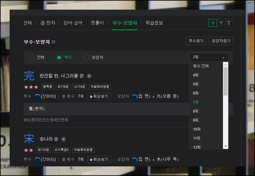 원하는 부수를 쉽게 찾으려면 먼저 획수를 선택하세요. 이렇게 하면 찾고자 하는 부수로 더욱 쉽게 원하는 정보를 발견할 수 있습니다. 자주 사용하는 부수는 금방 익숙해질 거예요.